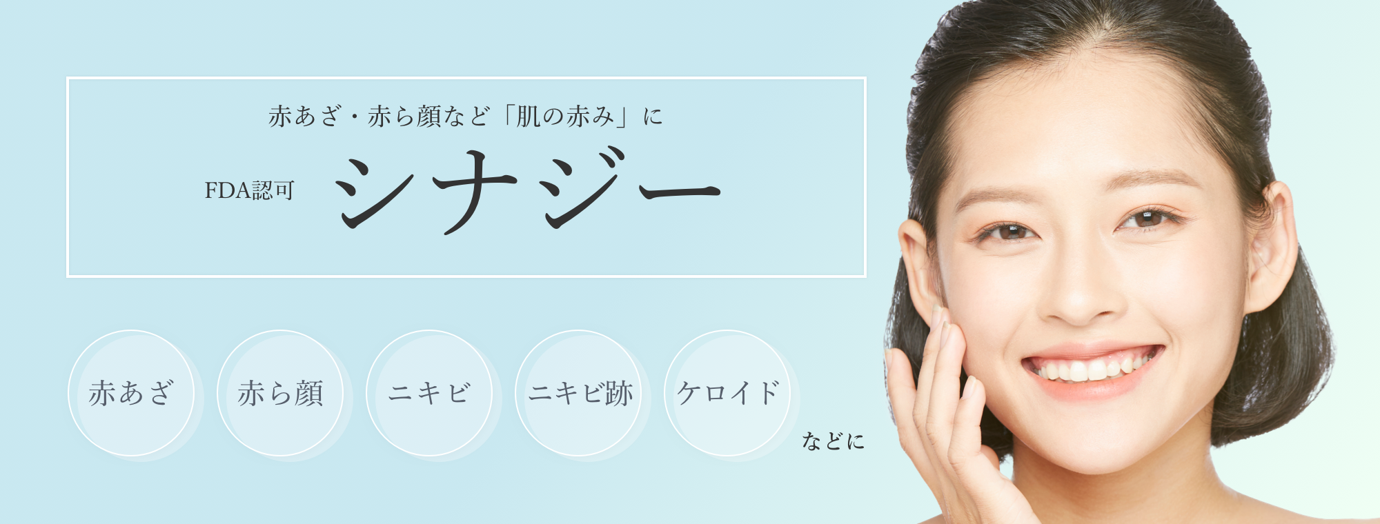 血管腫などの赤あざだけでなく、毛細血管拡張症や赤ら顔、赤みのあるにきび、にきび跡の赤みなどをシナジーが選択的に作用し改善します。血中の酸化ヘモグロビンに吸収されやすいため、血管系の病変に高い効果を示します。冷却作用により痛みを抑えられ、皮膚表面のダメージを最小限に抑えながら、熱を伝えることができます。
